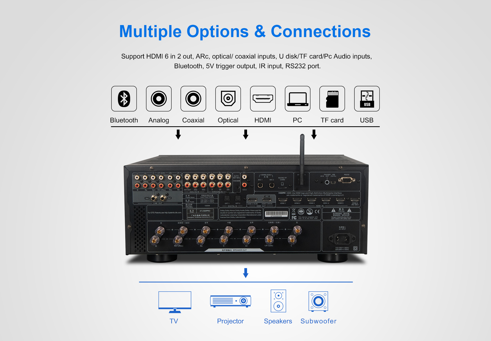 Der AT-2300PRO ist ein Dolby Atmos/DTS:X 7.1 AV-Receiver , das über ein intelligentes dynamisches Energiemanagement und eine Class-H-Schaltung verfügt und eine präzise Leistungsverteilung in Echtzeit für Mehrkanal-Szenarien ermöglicht.