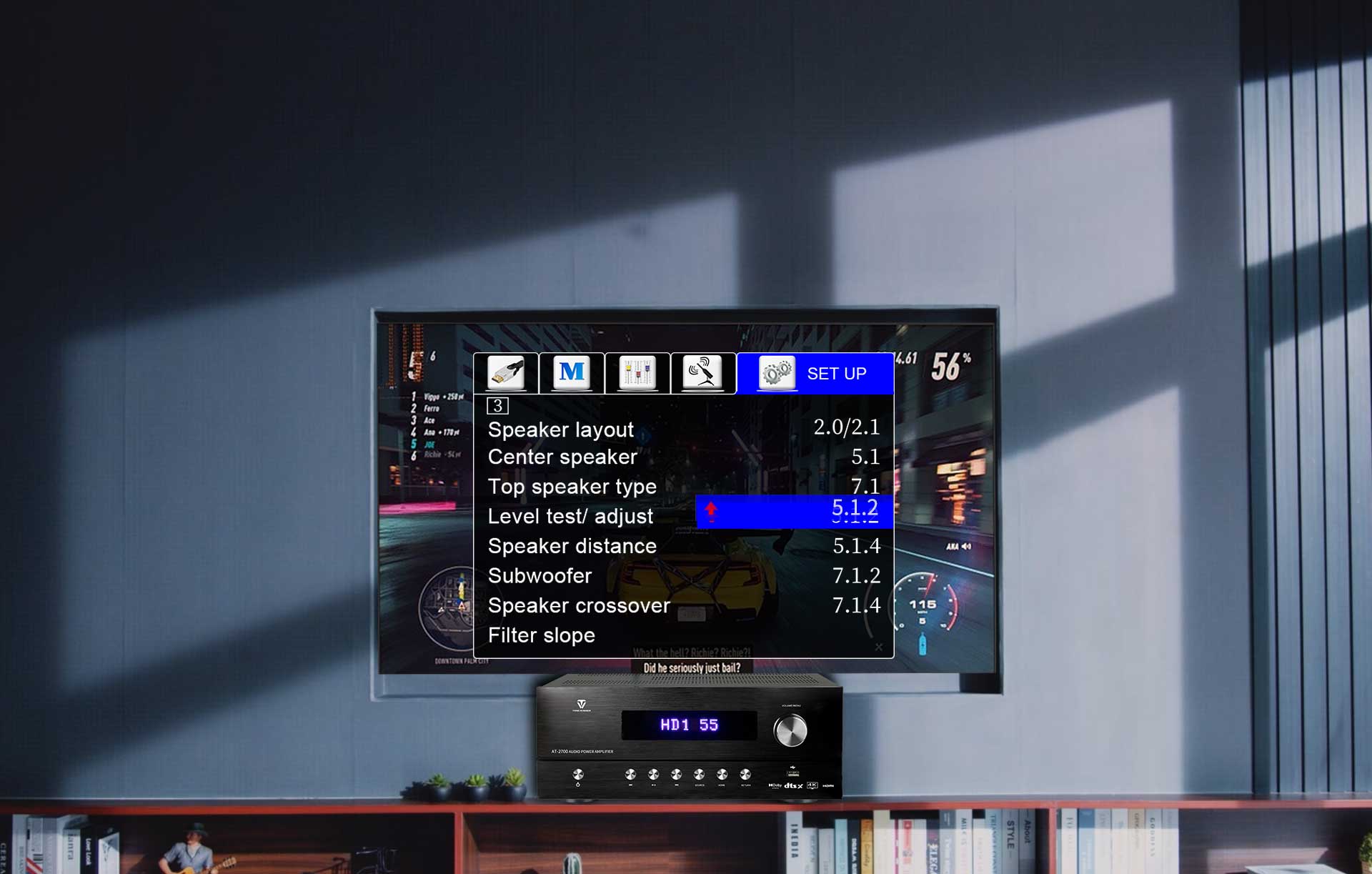 Einfaches Menü für bequeme Steuerung und Einstellungen. Sie können die Parameter anpassen, um einen besseren Klang auf dem Bildschirm zu erzielen, während der AV-Receiver in Betrieb ist.