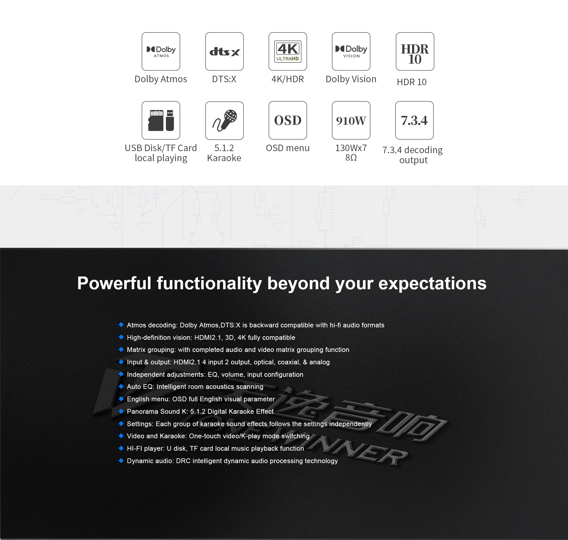 Sorgfältig ausgewählte integrierte Bauteile und mehrlagige, vergoldete Leiterplatten bilden die solide Grundlage für die Realisierung von Soundeffekten in Kinoqualität.