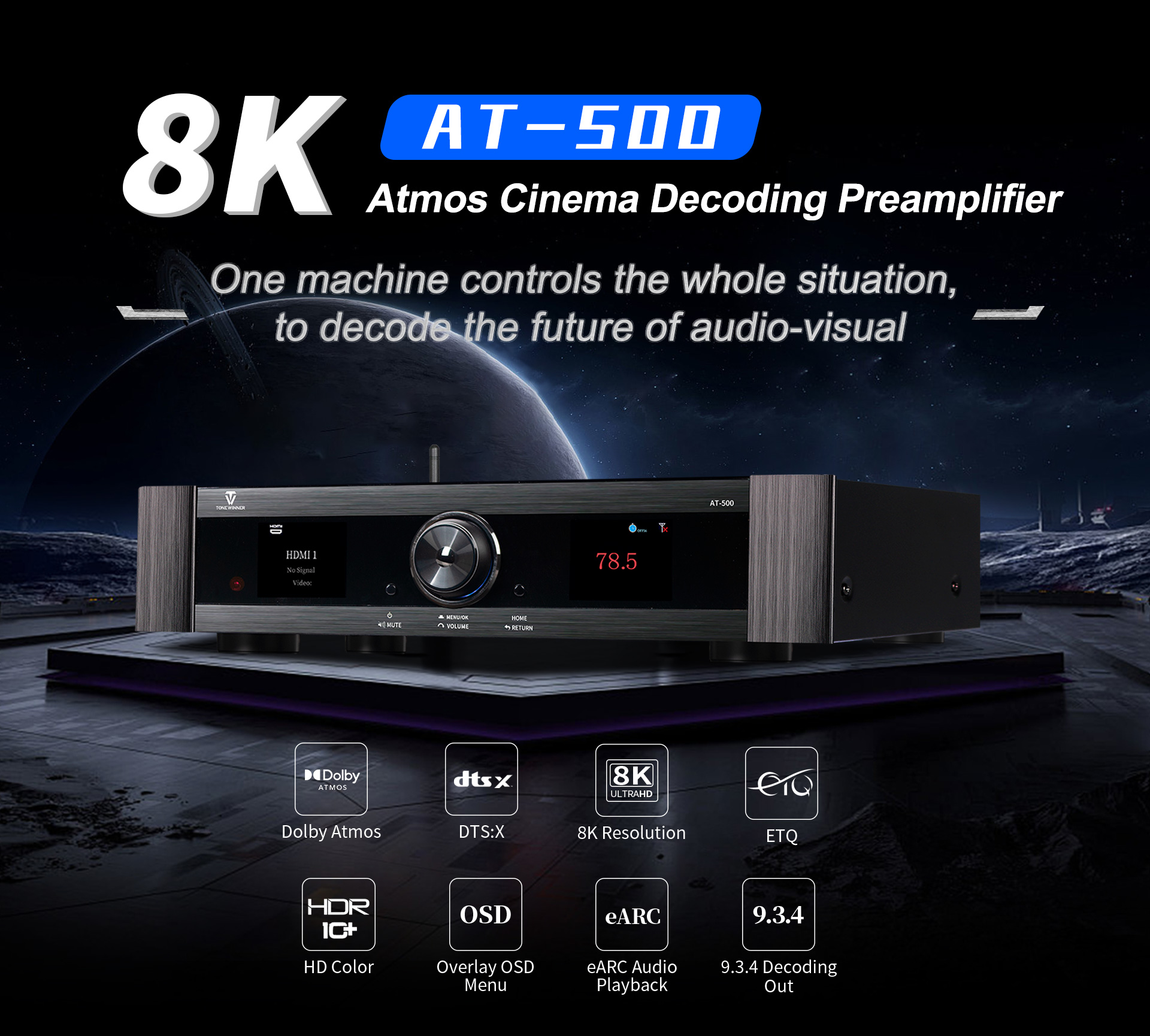 Der AT-500 ist ein immersiver 8K-AV-Prozessor, der speziell für High-End-Heimkinos entwickelt wurde. Er unterstützt Dolby Atmos und DTS:X sowie 8K-Videotechnologie. Zudem ist er kompatibel mit Videoformaten wie 3D, HDR10+ und Dolby Vision. Als zentrale Audio- und Videoeinheit in Ultra-HD vereint er Heimkino- und Musiksystem.