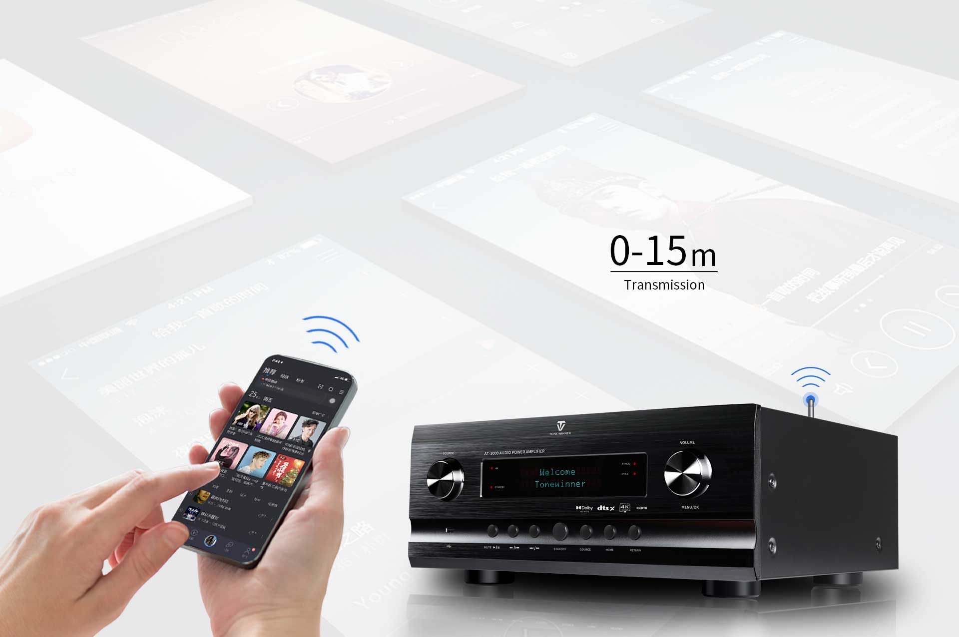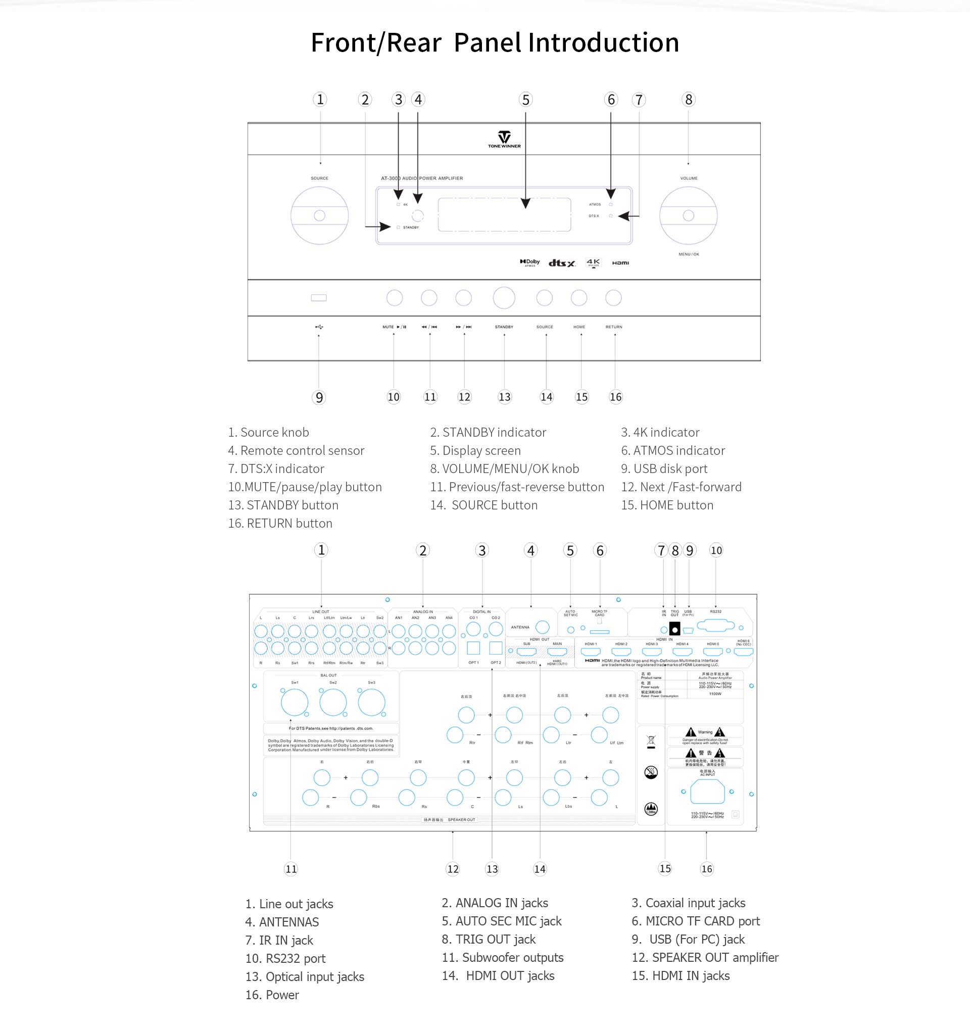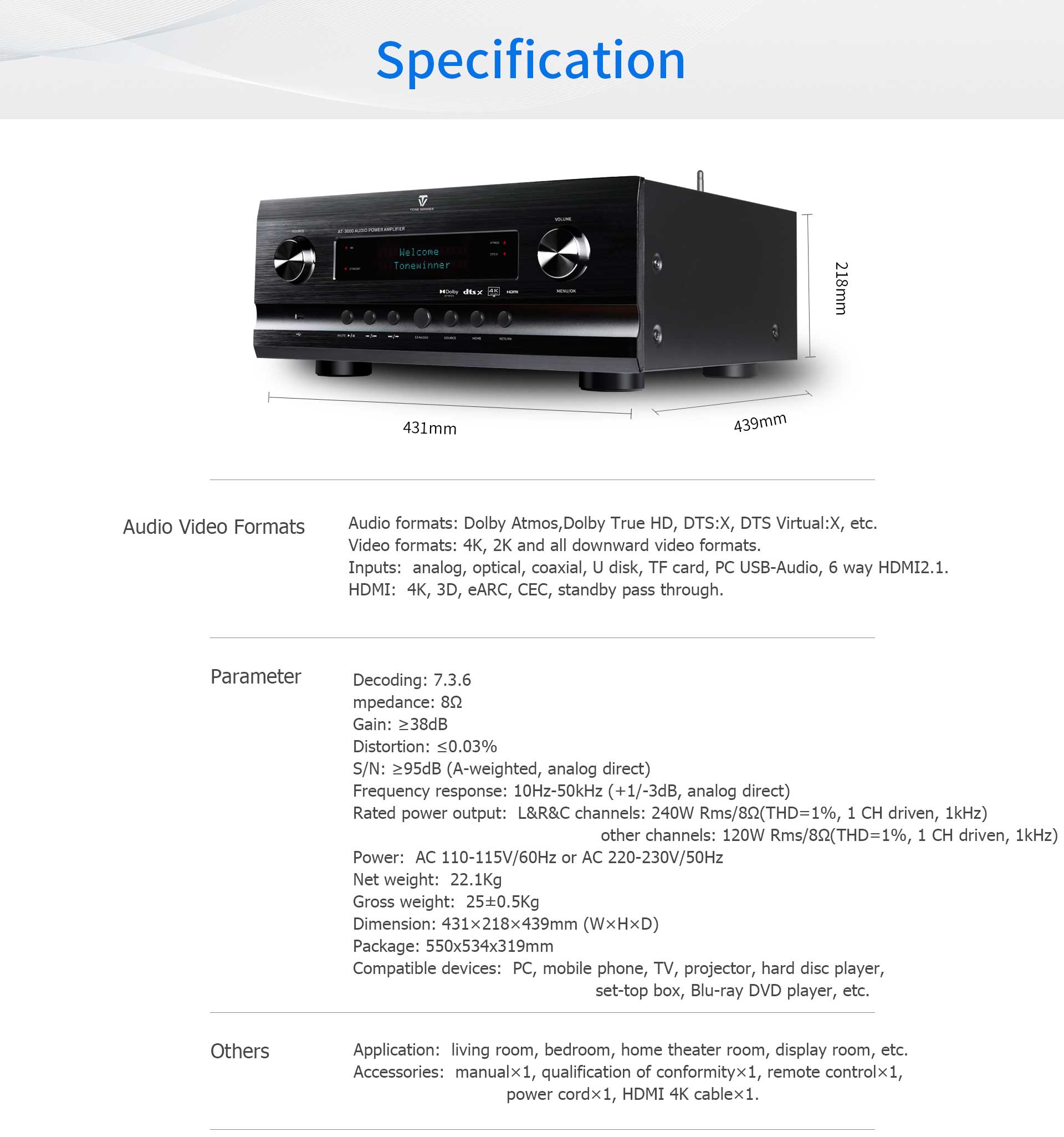 Die Firmware und Software wurden von den hauseigenen Entwicklern von Tonewinner mit originalem Quellcode und Patenten entworfen und bearbeitet. Alle Produkte werden nach einheitlichen Standards und unter strenger Qualitätskontrolle gefertigt. Der AV-Receiver AT-3000, der für eine Netzspannung von 110 V bis 230 V geeignet ist, bietet weltweit erstklassiges Audio- und Video-Entertainment.
