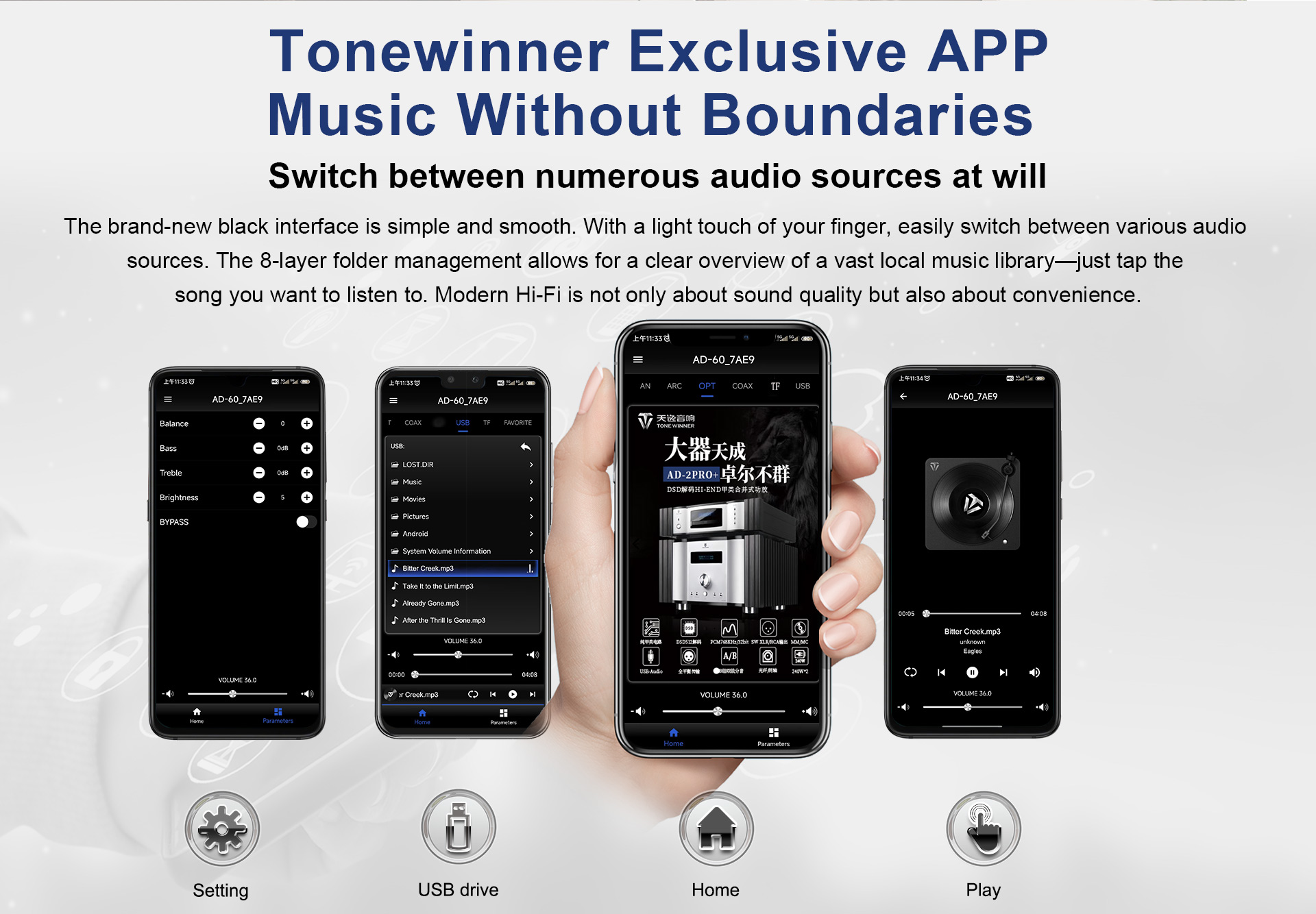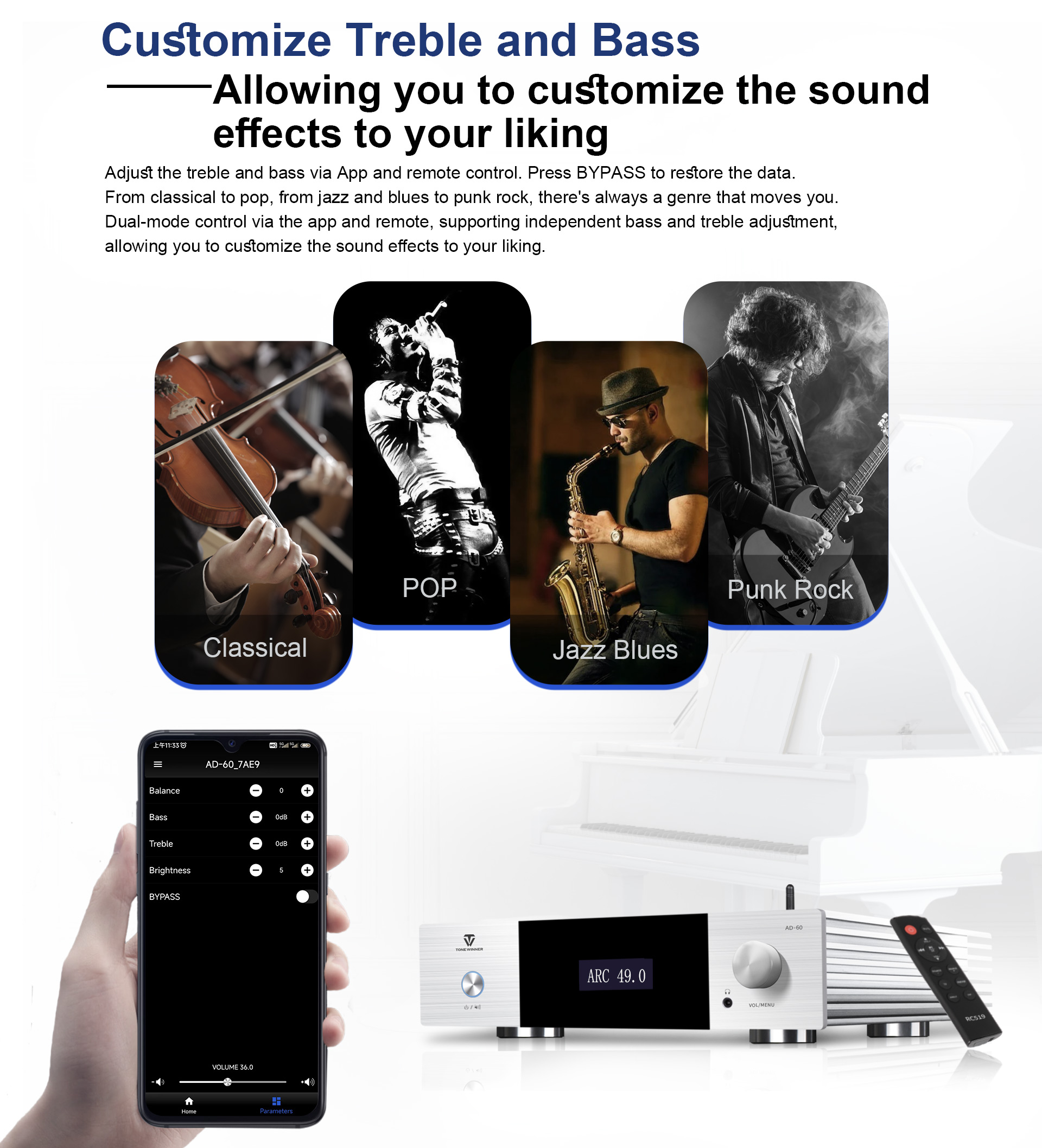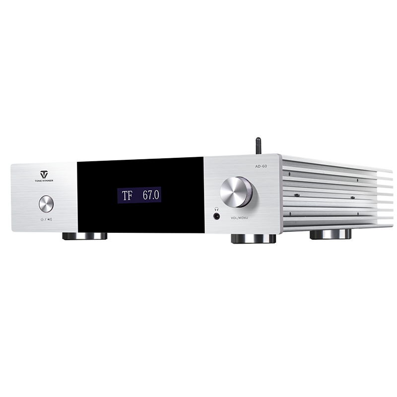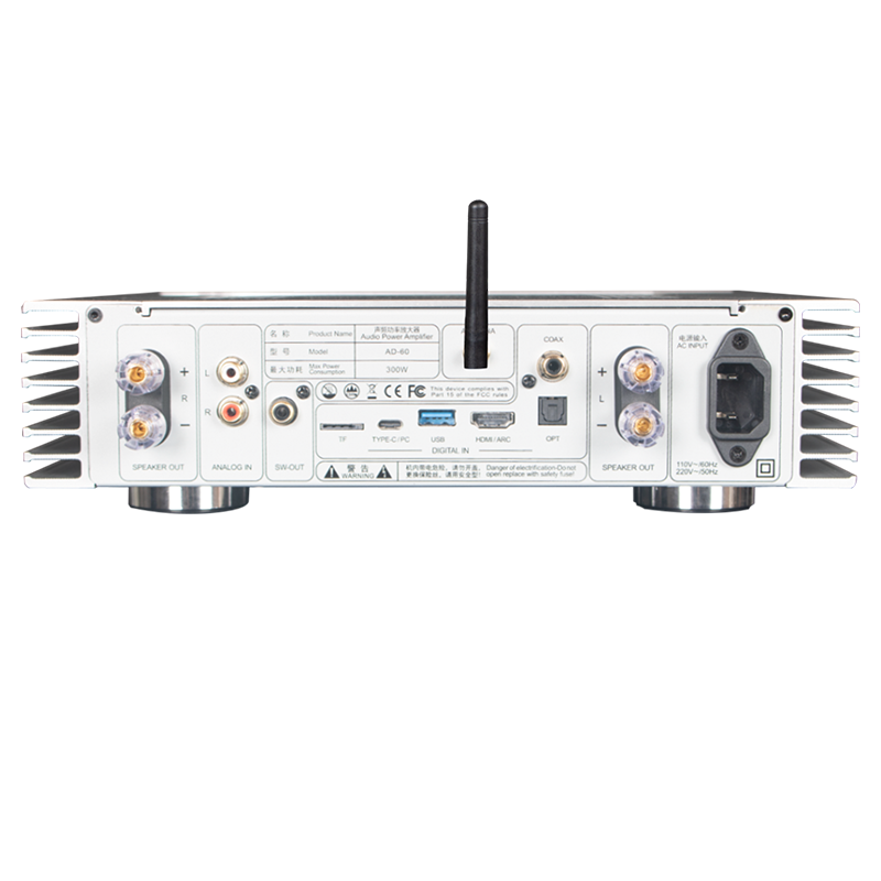 Der AD-60 ist ein integrierter Class-AB-Leistungsverstärker für 2.1-Systeme. Er vereint Vorverstärker, Endstufe, digitale Wiedergabe und Kopfhörerverstärker und lässt sich per USB-Stick, TF-Karte, Smartphone-App oder über digitale Eingänge (optisch, koaxial und PC-USB-Audio) steuern. Dank seines durchdachten Designs und der Verwendung hochwertiger Materialien und Komponenten liefert er einen präzisen und detailreichen Klang. Der AD-60 ist ein moderner und kostengünstiger Leistungsverstärker für HiFi-Unterhaltung.