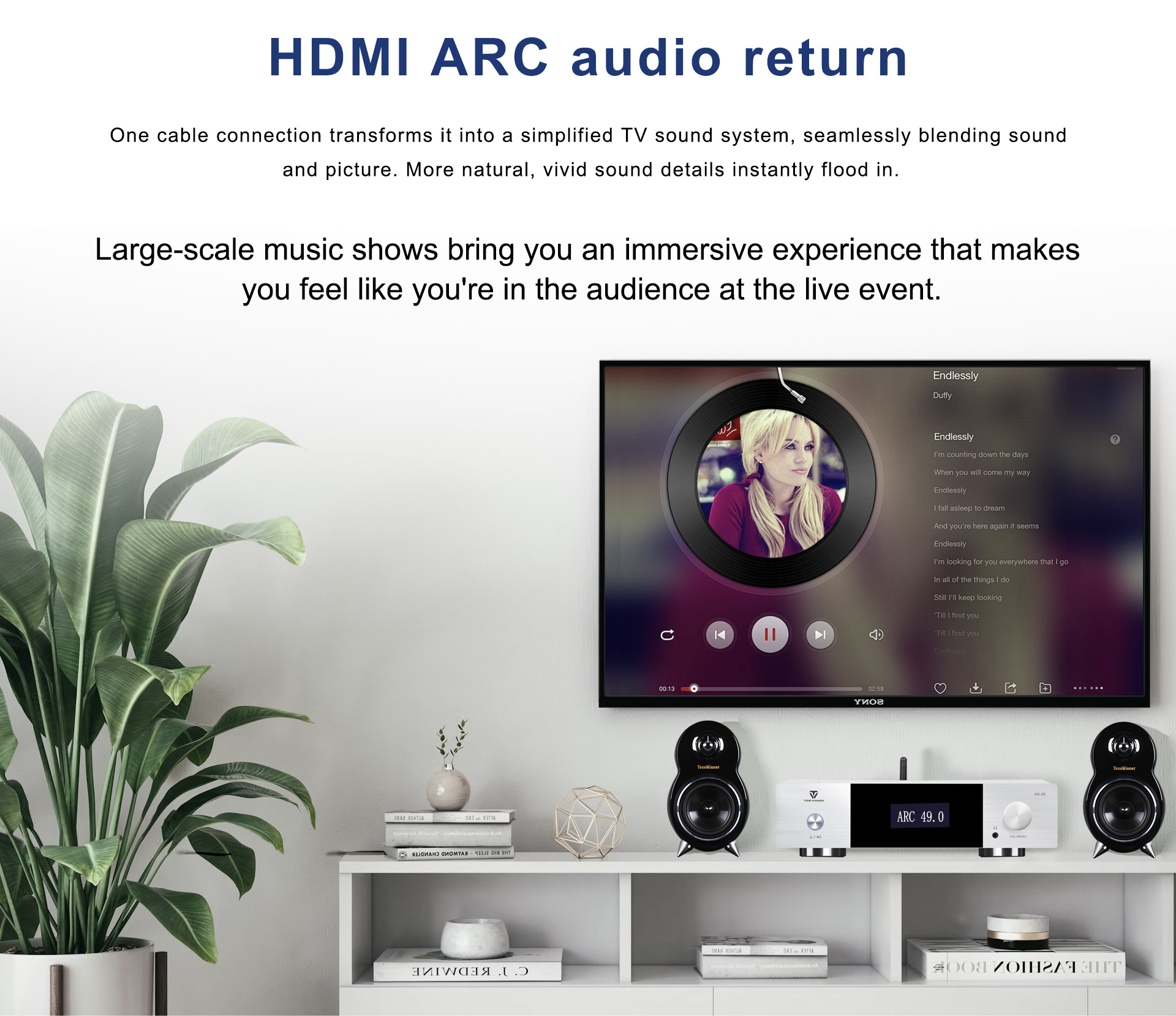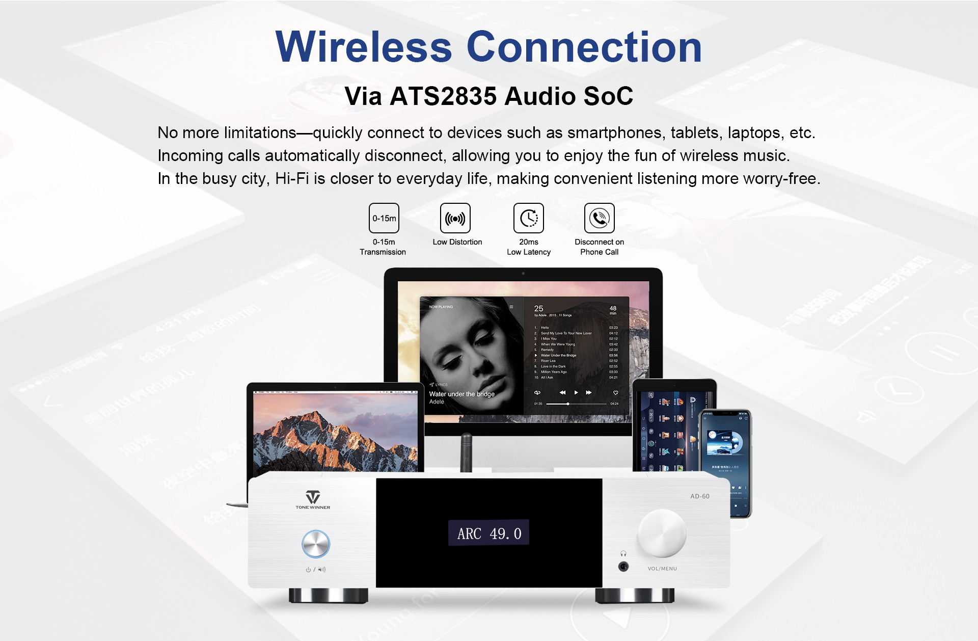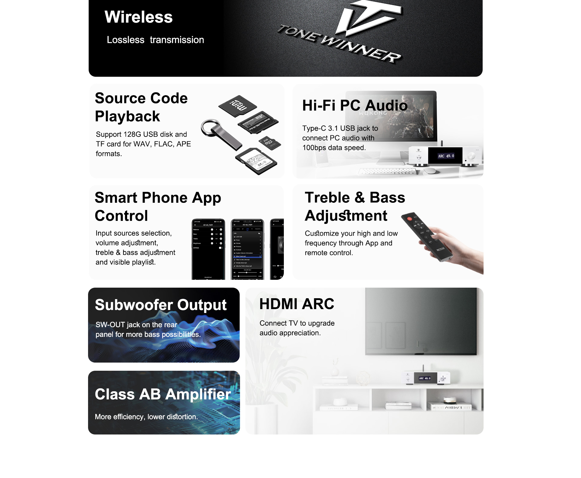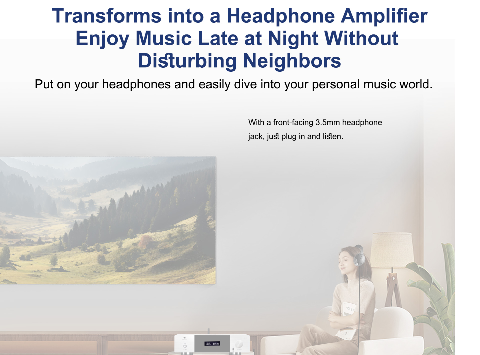 Der AD-60 ist ein integrierter Class-AB-Leistungsverstärker für 2.1-Systeme. Er vereint Vorverstärker, Endstufe, digitale Wiedergabe und Kopfhörerverstärker und lässt sich per USB-Stick, TF-Karte, Smartphone-App oder über digitale Eingänge (optisch, koaxial und PC-USB-Audio) steuern. Dank seines durchdachten Designs und der Verwendung hochwertiger Materialien und Komponenten liefert er einen präzisen und detailreichen Klang. Der AD-60 ist ein moderner und kostengünstiger Leistungsverstärker für HiFi-Unterhaltung.