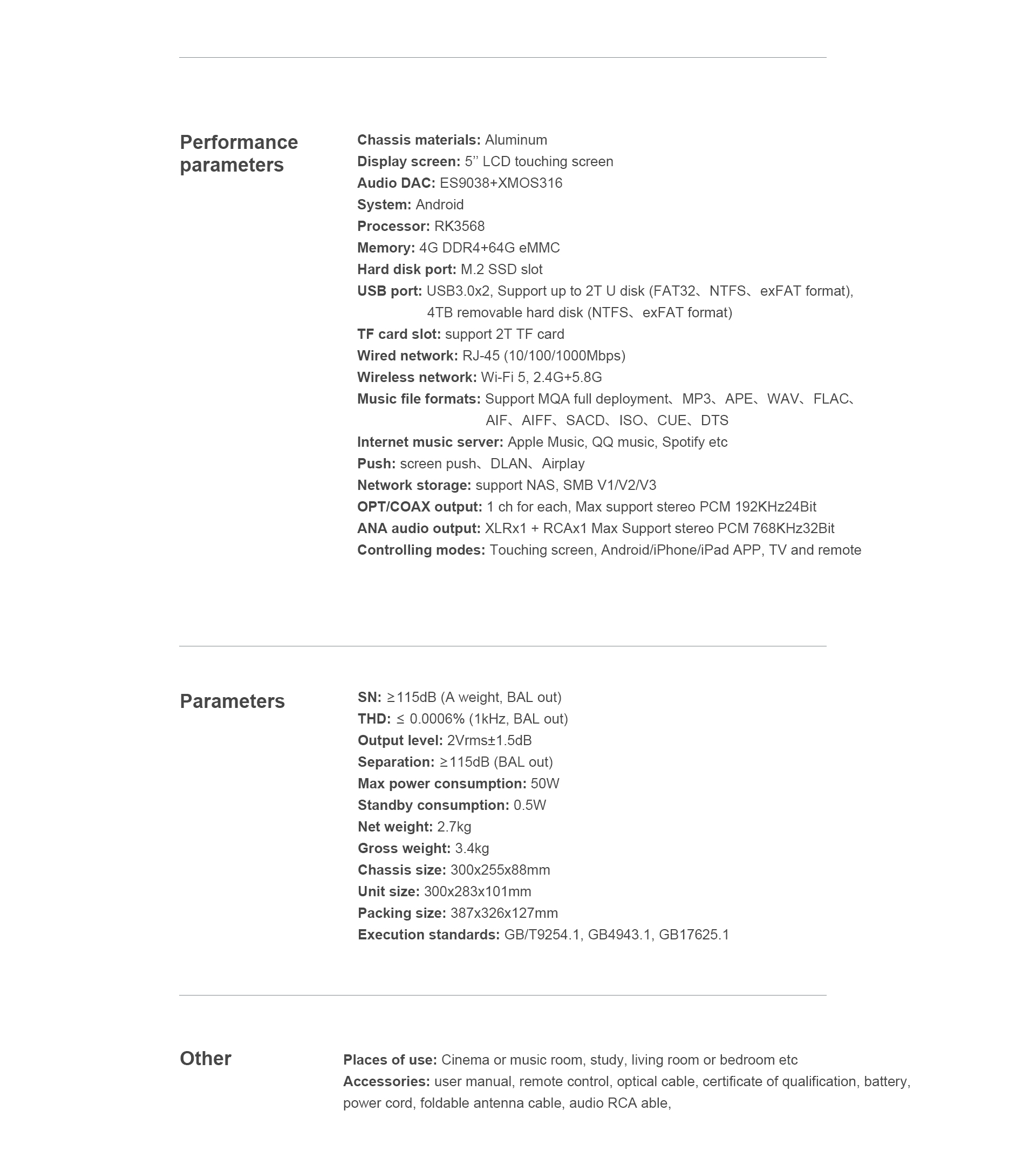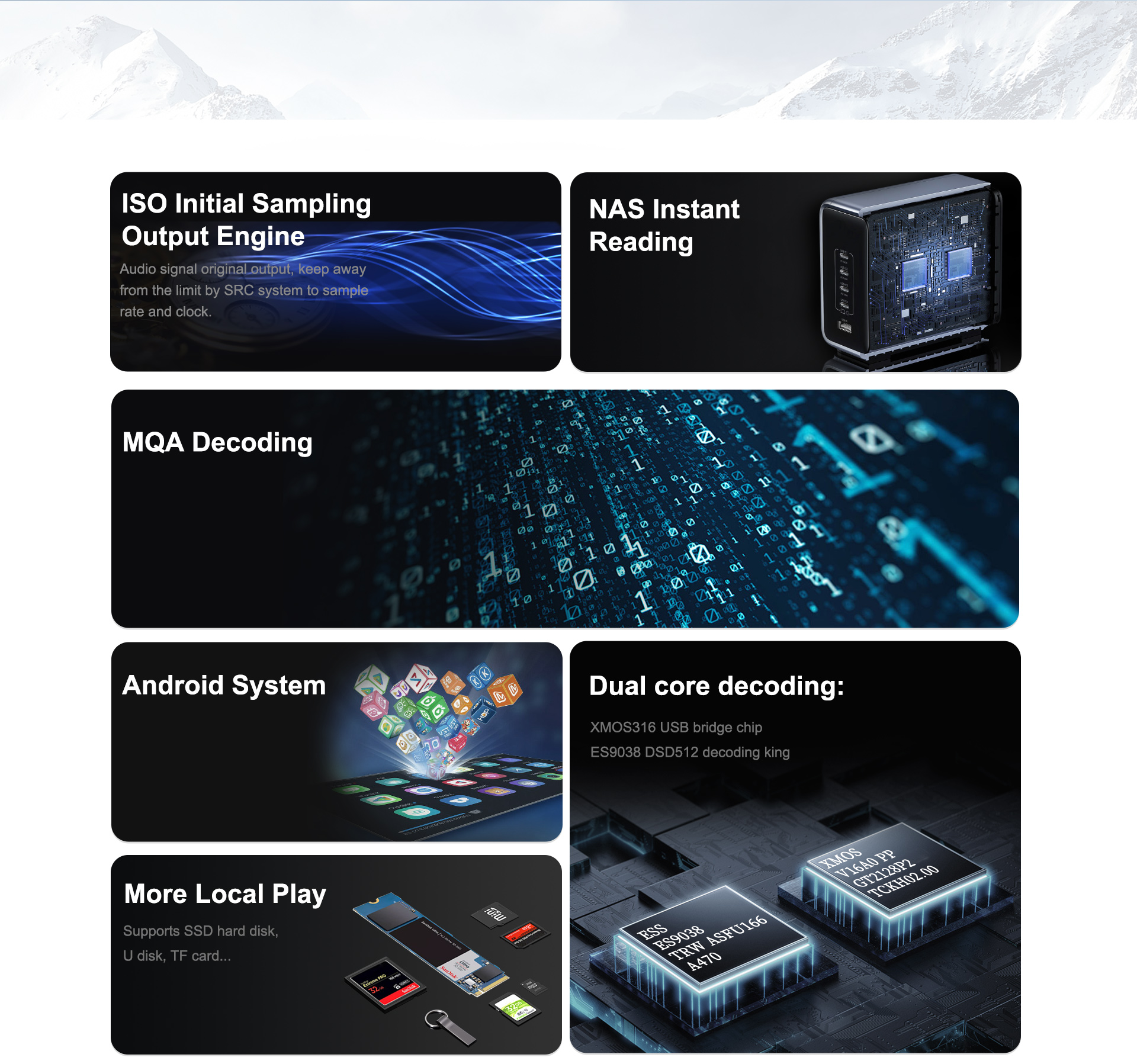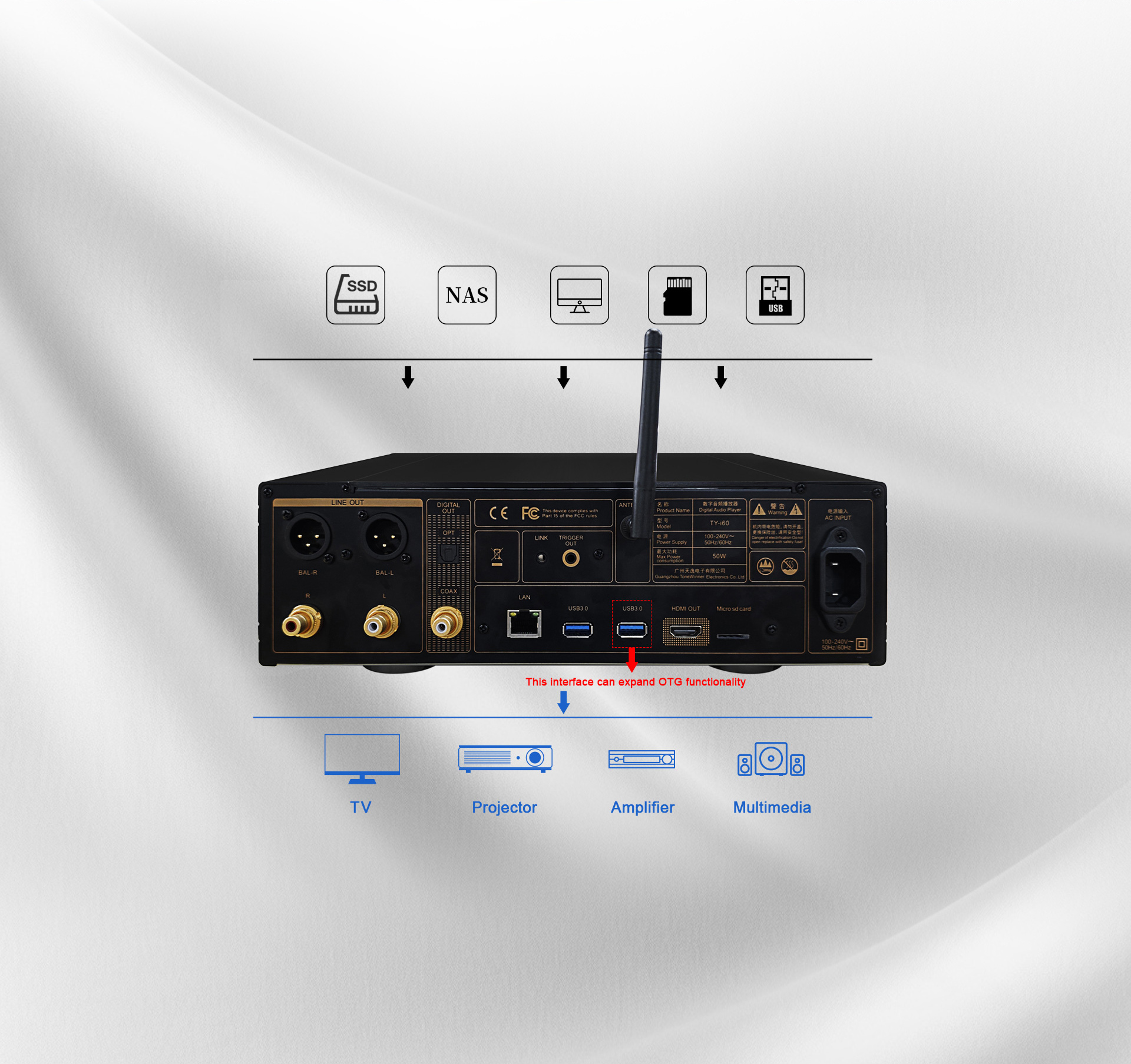 Lokale Wiedergabeeingänge: M.2-SSD-Festplatte, 2 x USB 3.0-Anschlüsse (OTG erweiterbar), 1 x Micro-SD-Karte.