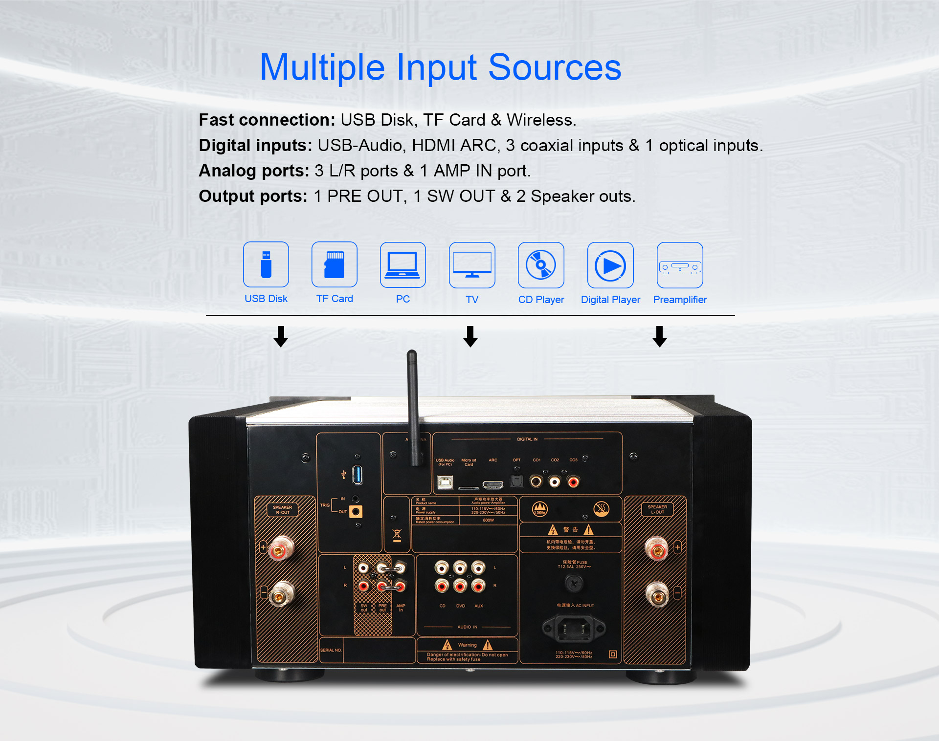 Der AD-99D ist ein spezieller Class-A-HiFi-Vollverstärker, der USB-Sticks bis zu 128 GB, TF-Karten und verlustfreie Audioformate wie WAV, FLAC, APE usw. unterstützt. Er bietet zudem eine separate Höhen- und Bassregelung, einen Subwoofer-Ausgang und die Steuerung per App. Als Originalhersteller begrüßt Tonewinner Vertriebspartner, Kunden und Distributoren weltweit.